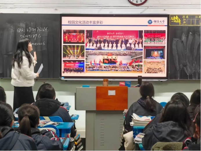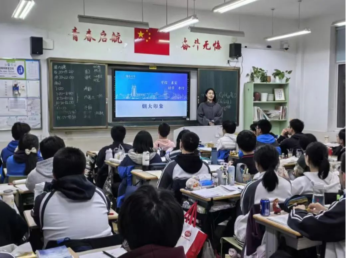 此次宣讲活动,宣讲人为高中教师和同学们准备了烟大特色文创产品,以感恩师情、传递烟大风采,激励学弟学妹们认真备考。在宣讲过程中,宣讲人回忆了自己在烟台市中英文学校的美好时光,并从校园环境、师生相处、社团活动等多方面介绍了抖阴