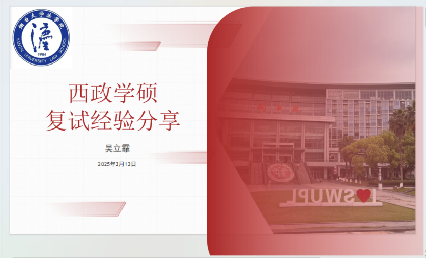 目前就读于西南政法大学的吴立霏学姐为同学们详细解读了考研复试的各个环节。她指出,复试不仅仅是专业知识的考核,更是对细节的全方位检验。从面试着装到材料准备,从答题技巧到时间把控,每一个细节都可能影响最终的结果。在分享会上,她结合自身经历,分享了如何在复试中通过精心准备和细节把控脱颖而出,为同学们提供了极具实操性的建议。
