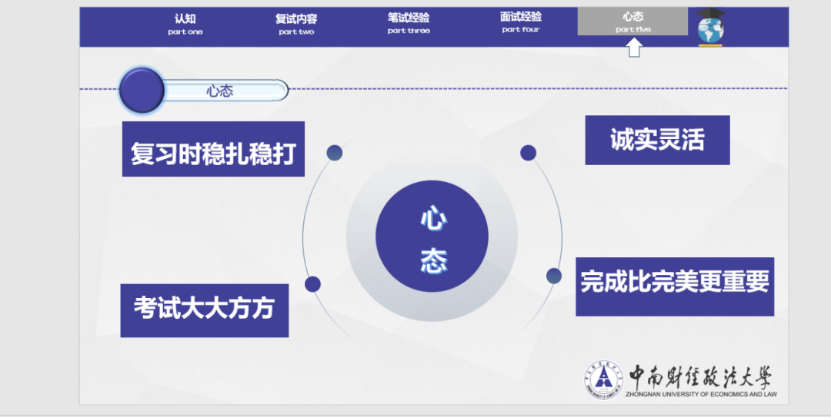 目前就读于中南财经政法大学的郑嘉文学姐为同学们讲述了复试备考期间心态管理的重要性。她指出,考研复试不仅是知识的比拼,更是心态的较量。在分享会上,她分享了自己如何通过合理规划、积极暗示、适度放松等方式调整心态,保持稳定的情绪,从而在复试中发挥出最佳水平。她的经验让同学们深受启发,纷纷表示要在备考中学会管理情绪,稳定心态。