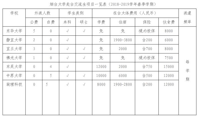 根据我校与台湾地区友好院校校际交流协议, 我校将于2020年2月选派全日制在校本科生或研究生作为交流生赴台湾高校学习研修,现将有关事项通知如下。