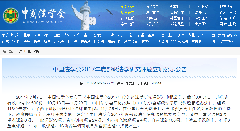 2017年11月29日,中国法学会公布了“2017年度部级法学研究课题立项公示公告”,抖阴