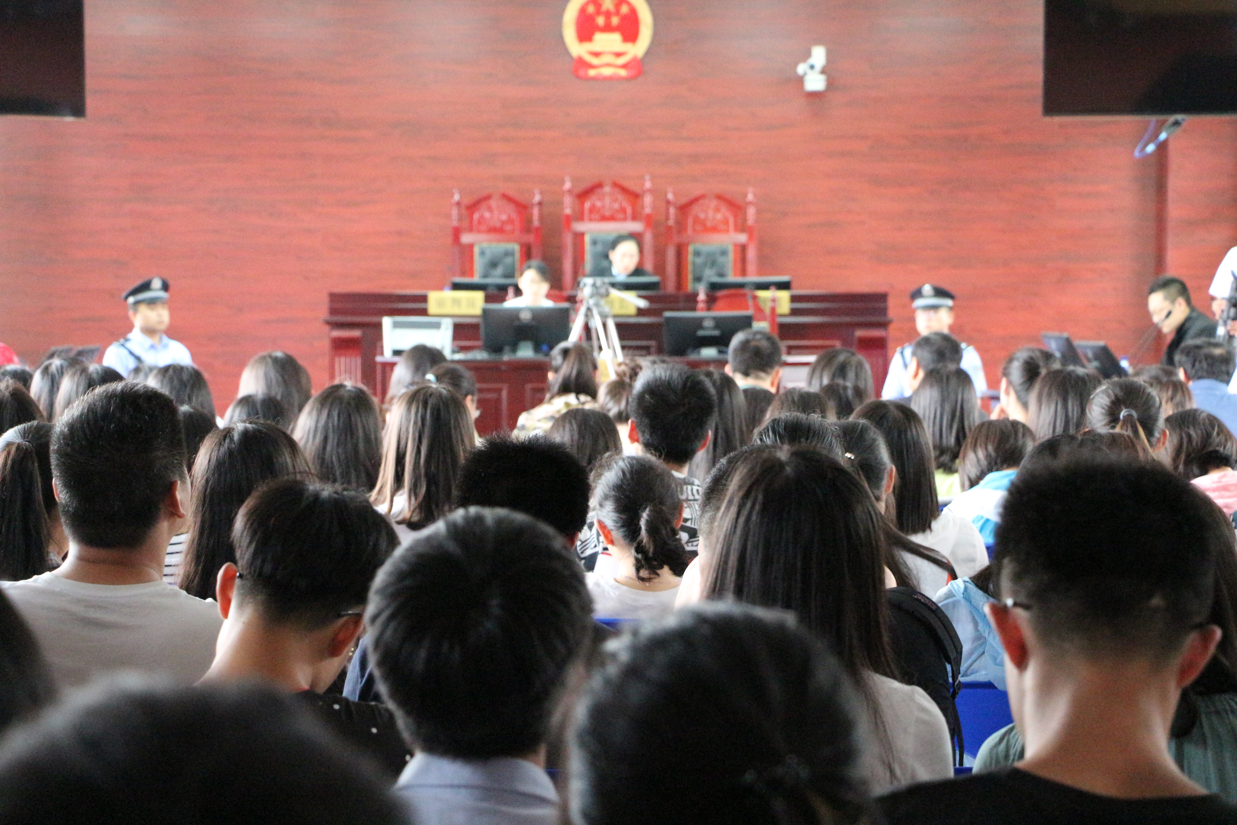 牟平区人民法院是抖阴 的专业实践基地,与抖阴 在法学教育和专业实践教育相结合上有着长期的合作关系,抖阴 与牟平区法院合作将真实的庭审“引进”学校,把理论与实际相联系,使得原来的知识变得形象化,更有利于大学生们将书本中的知识学以致用,让学生离开校园后能够尽快适应司法实践的要求,实现角色的转换。当得知开庭的消息后,数百名抖阴 的同学报名参加庭审观摩,这样“足不出校看庭审”的真实案件审判,对于他们来说,机会难得,但由于庭审现场无法容纳,部分学生在场外站着听完了全部庭审。