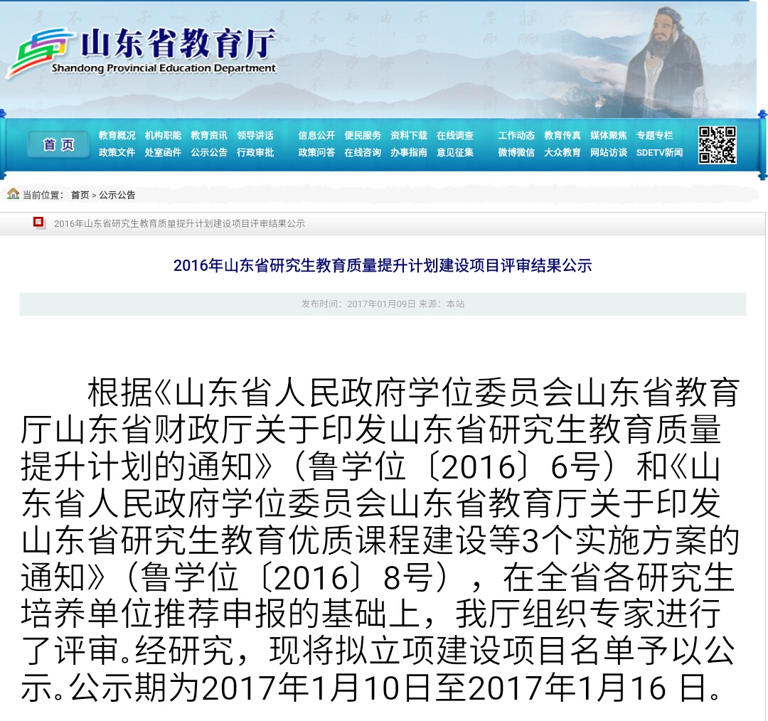 根据《山东省人民政府学位委员会山东省教育厅山东省财政厅关于印发山东省研究生教育质量提升计划的通知(鲁学位〔2016〕6号)和《山东省人民政府学位委员会山东省教育厅关于印发山东省研究生教育优质课程建设等3个实施方案的通知》(鲁学位〔2016〕8号),我省启动了“山东省研究生教育优质课程”、“ 山东省专业学位研究生教学案例库”和“山东省研究生教育联合培养基地”评选工作。近日,在全省各研究生培养单位推荐申报的基础上,山东省教育厅组织专家进行了评审,抖阴