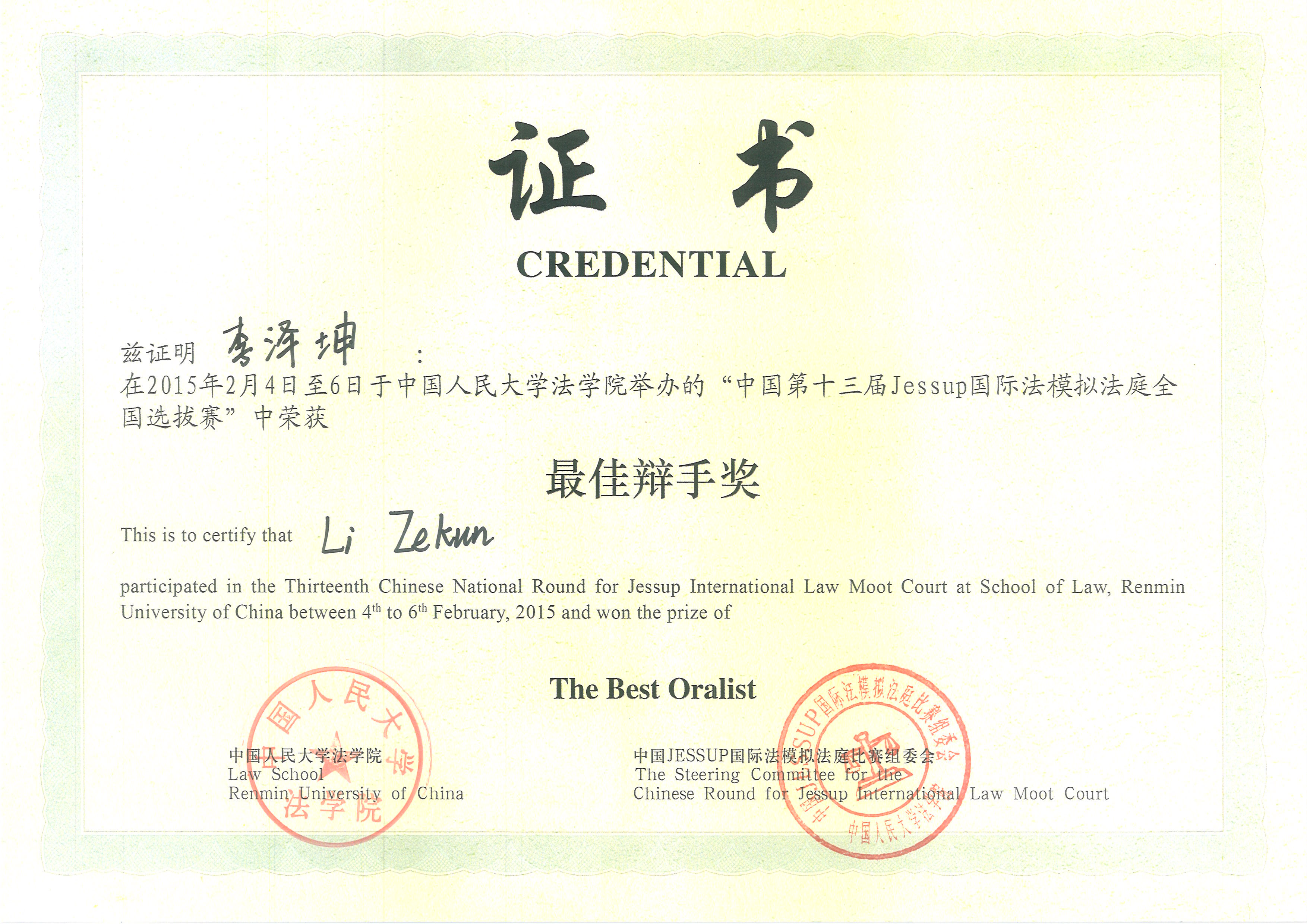 法学专业本科学生李泽坤以出色的场上表现赢得评审法官的一直赞可,荣获该项比赛个人荣誉最高奖——“Best Oralist”(最佳辩手)。