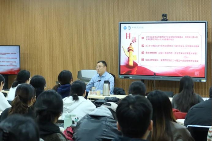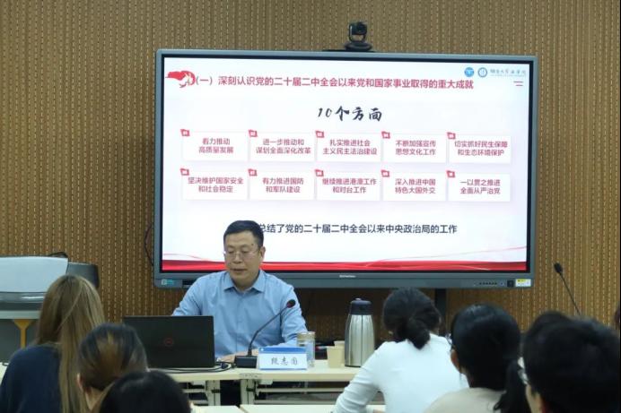 “立足学院实际全面抓好党的二十届三中全会精神贯彻落实......”。段书记从“更加重视人才培养:立院之本”“建设高水平师资队伍:强院之基”“加大激励科研产出:强院之要”“继续加大学科建设:强院之首”“融入区域服务地方:兴院之策”“全面加强党的建设:兴院之魂”六个方面向在座发展对象及入党积极分子介绍抖阴