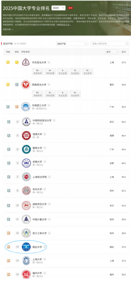知识产权专业在参与排名的57所院校中位列第13,山东省内排名位列第1。