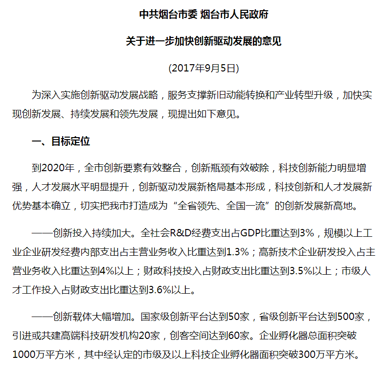 为深入实施创新驱动发展战略,服务支撑新旧动能转换和产业转型升级,加快实现创新发展、持续发展和领先发展,近日,中共烟台市委,烟台市人民政府正式发布了《关于进一步加快创新驱动发展的意见》。意见指出,加快创新驱动发展的“目标定位”是到2020年,全市创新要素有效整合,创新瓶颈有效破除,科技创新能力明显增强,人才发展水平明显提升,创新驱动发展新格局基本形成,科技创新和人才发展新优势基本确立,切实把我市打造成为“全省领先、全国一流”的创新发展新高地。