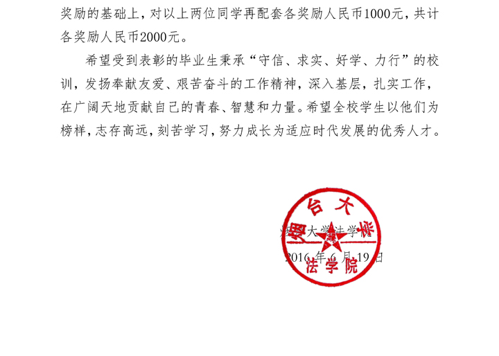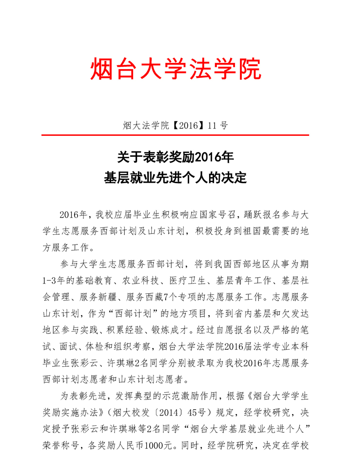 烟大抖阴 【2016】11号关于表彰奖励2016年基层就业先进个人的决定