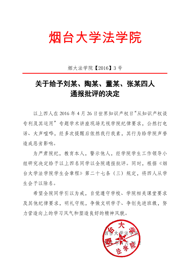 烟大抖阴 【2016】3号关于给予四名学生通报批评的决定